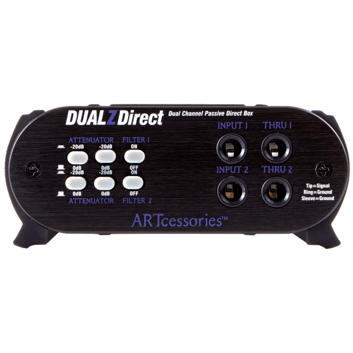 De ART DUALZDirect is een passieve 2-kanaals DI-box die verder gaat dan de standaard functionaliteiten van traditionele modellen. Dankzij een schakelbaar lowpass-filter biedt deze DI-box optimale bescherming tegen storingen in het hoogfrequente spectrum. Het geïntegreerde Bessel-filter bevindt zich buiten het hoorbare bereik en voorkomt dat radiofrequente interferentie het audiosysteem binnendringt. Ideaal bij gebruik met een computer DAW: het filter onderdrukt effectief digitale ruis en artefacten afkomstig van computers, wat resulteert in een schoner en storingsvrij signaal richting je monitors.