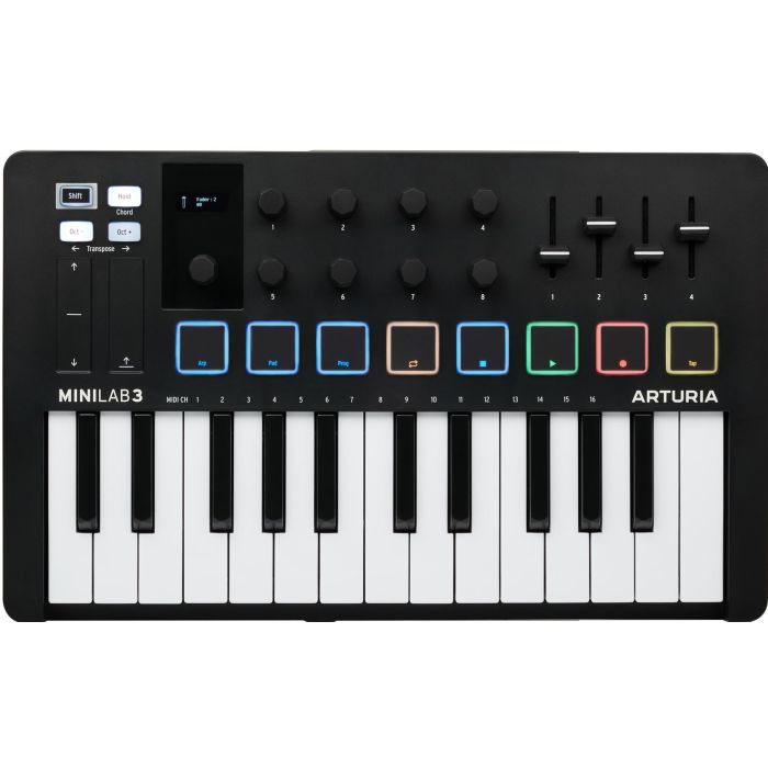 De Arturia MiniLAB 3 NOIR is een compacte MIDI-keyboard- en padcontroller waarmee je direct uit de doos muziek kunt maken. Met een creatieve plug-and-play-workflow, toewijsbare bedieningselementen, 500 samengestelde geluiden uit de bibliotheek van Analog Lab en een creatieve software bundel van wereldklasse, is MiniLAB 3 ontworpen om eindelijk beginners én professionals te helpen om echt ondergedompeld te worden in hun muzikale creatiestroom, wat je stijl ook is.