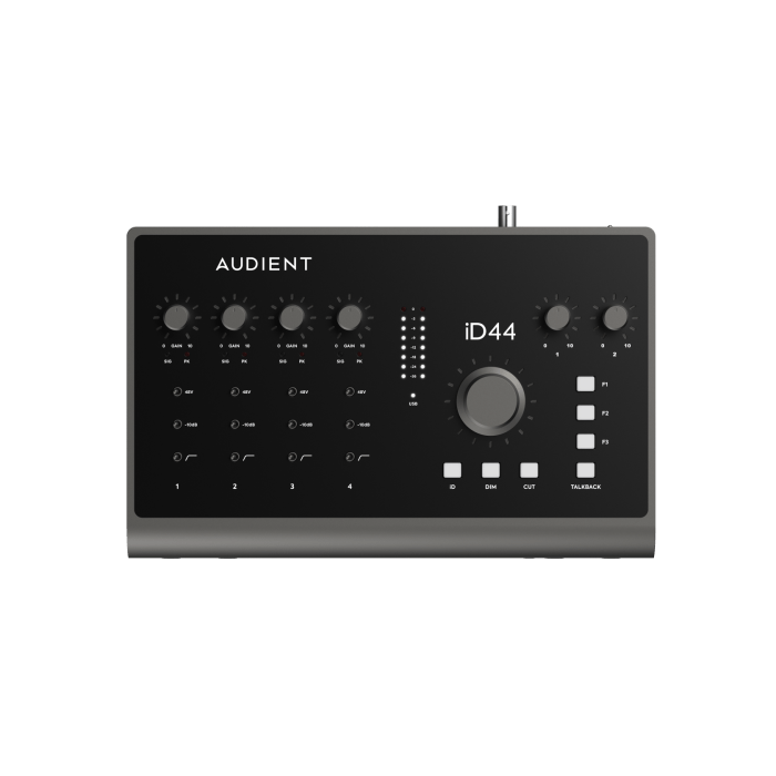 De iD 44 is op dit moment de krachtigste interface die Audient te bieden heeft. Met 4 eerste klas pre-amps en 2 JFET Hi-z jack input is deze interface geschikt om gemakkelijk meerdere sporen tegelijk op hoge kwaliteit op te nemen. De DSP Mixer die we in the box softwarematig bedienen bied je de mogelijkheid om meerde mixen te maken voor de verschillende artiesten. En de twee ADAT in- en outputs geven je mogelijkheid om tot wel 16 kanalen toe te voegen. De drie hoofdtelefoon outputs maakt het mogelijk om samen naar de zelfde mix te luisteren en zo je nummer tegelijk op te nemen.