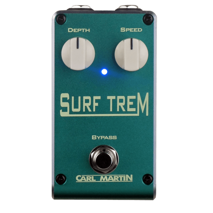 Trem(olo) wordt in principe gedefinieerd als een cyclische variatie van volume gecontroleerd door een oscillator met lage frequentie, of voor ons gitaristen... iets dat het gitaargeluid snel of langzaam laat oscilleren tussen stil en luid. Beroemd geworden in de jaren 50 en 60 door bands als de Shadows en Dick Dale voor dat beruchte 'surfgeluid', bleef de Trem hangen voor vele andere gitaargrootheden als Robin Trower, Hendrix en Page, tot aan SRV en verder. De Carl Martin Surf Trem heeft het hele effect vereenvoudigd tot 2 simpele knoppen (net als het tremcircuit op onze vintage Fenders en Ampegs), Depth en Speed. De Depth knop regelt hoeveel van het effect je in je gitaarsignaal wilt hebben, en de Speed knop regelt uiteraard de snelheid van de trilling.