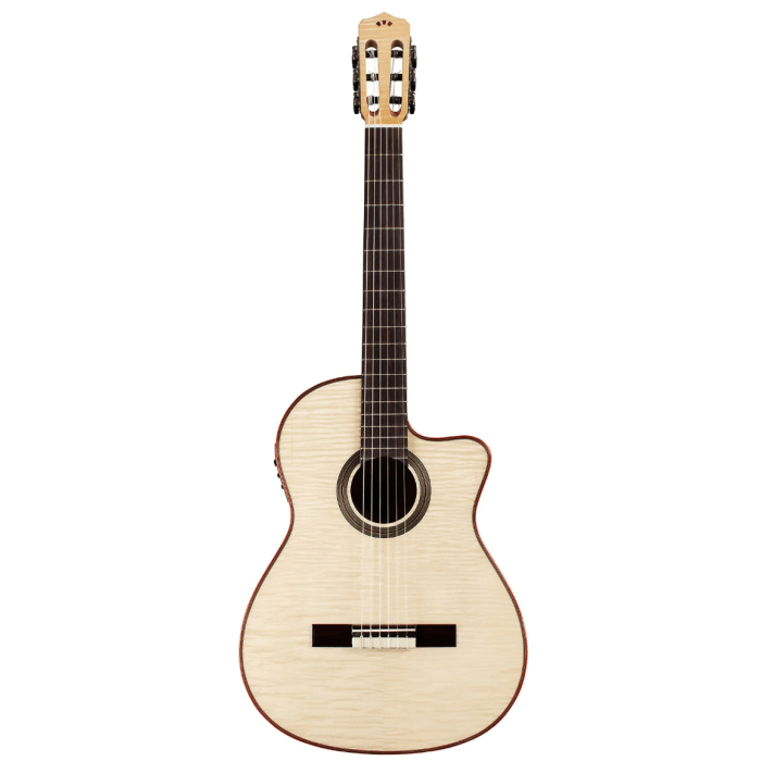 Fusion 12 Exotic Top gitaren leveren een traditionele nylonsnarige toon terwijl ze ook een opvallende moderne esthetiek hebben. Een ultradun laagje echt exotisch houtfineer is aangebracht op hun massief-spruce bovenblad, wat resulteert in een dramatisch uiterlijk zonder de toon negatief te beïnvloeden.