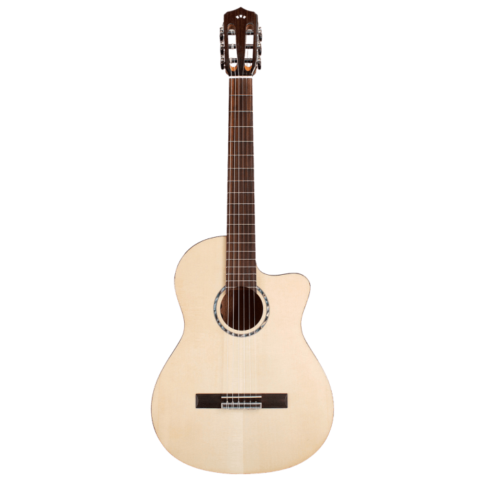 Met de Fusion 5 start Cordoba haar Fusion series. De Fusion series biedt een klassieke gitaar met moderne specs. Dit maakt de overstap van staalsnarige gitaar naar nylonsnarig een makkelijker. De Cordoba Fusion 5 is uitgerust met een massief sparren bovenblad, (gelamineerde) mahonie zij- en achterkant, side dot positiemarkeringen, een cutaway en een modern ogende parelmoer rozet.