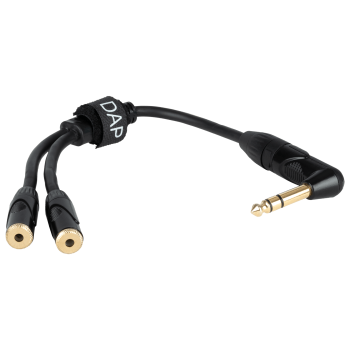 Deze gebalanceerde stereokabel heeft een rechthoekige mannelijke 6,3 mm TRS-connector aan het ene uiteinde en twee vrouwelijke 3,5 mm TRS mini-jack-connectors aan het andere uiteinde.