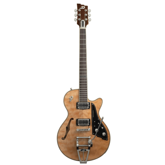 De pickups zijn een set Duesenberg's Grand Vintage humbuckers, maar als specifieke aanvulling hierop heeft dit Alliance model ook een geïntegreerde piëzo pickup in de brug. Deze piezo kan worden gemengd met de electro magnatic pickups en middels een discrete schakelaar geïntegreerd in de slagplaat schakel je hem aan en uit. En natuurlijk kon de iconische Tremola niet ontbreken.