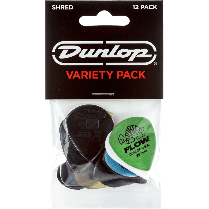 Dit Shred Variety Pack bestaat uit: Ultex Sharp 2.0 mm, Tortex Sharp 1.5 mm, Tortex Flow .88mm en 1.0 mm, Delrin Prime Grip 1.5 mm en 2.0 mm, Flow Standard 1.5 mm en 2.0 mm, Max- Grip Jazz III Carbon Fibre, Max-Grip Jazz III Zwart, Jazz III Ultex en Jazz III XL Stiffo.