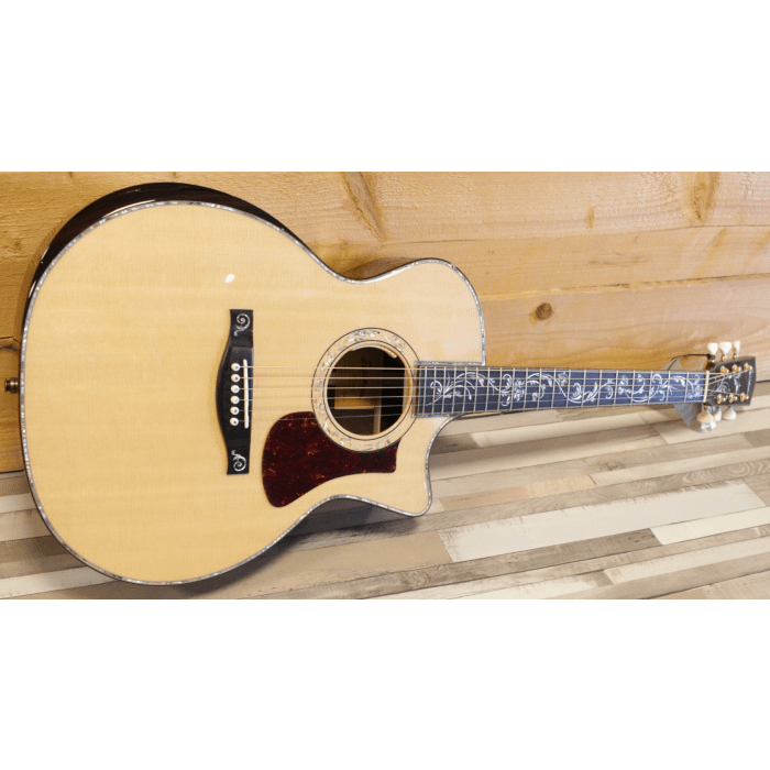 De finish in combinatie met het prachtige gedetaileerd inlegwerk en de schitterende bindings, maakt dat deze gitaar een enorm chique uitstraling heeft. De neck is van mahonie met een ebben toets die voorzien is van prachtig "tree of life" inlegwerk. Dit is standaard bij de AC922, maar o zo prachtig uitgevoerd! In het oog springende nieuwe features zijn de ebben bevel cut en het extra projectie klankgat in the bovenste schouder van de gitaar. Die eerste is aangebracht voor het spelcomfort, de laatste feature zorgt ervoor dat de gitaar groots en zeer rijk klinkt en geeft simpelweg meer klank door aan de speler. De AC922 is standaard voorzien van een LR Baggs Element VTC (volume & tone control) en komt uiteraard inclusief Eastman hardcase.