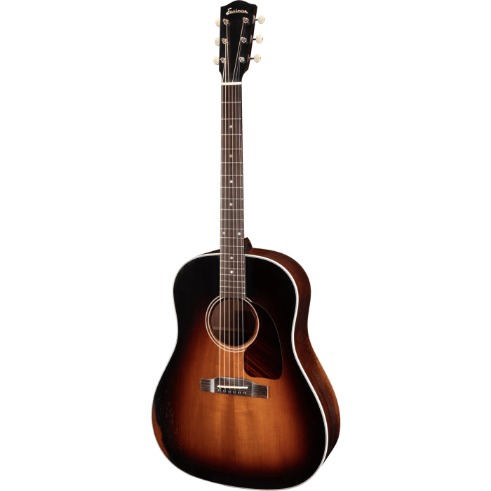 Slope shoulder dreadnought zijn simpelweg aantrekkelijk...dit model ademt de geschiedenis van de akoestische flattop western gitaar. De E15SS is Eastman's versie van een J50 met de iconische J45 bodyvorm. Hij heeft een massief adirondack spruce bovenblad, massief mahonie zij- en achterkant, mahonie hals, palissander toets en handgesneden scalloped X-bracing. Helemaal raak is de smaakvolle aged look van deze vintage antique varnish / "V" versie!