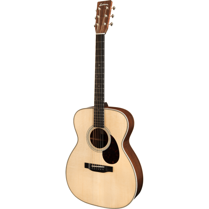 Daarnaast heeft hij een erg hoogwaardige afwerkingen met de herringbone trim, een ebbenhouten toets en brug, handgesneden scalloped X-bracing, en abalone 'snowflake' inleg. Deze hoge kwaliteit details zorgen ervoor dat Eastman dicht in de buurt komt van zijn duurdere Amerikaanse concurrenten.