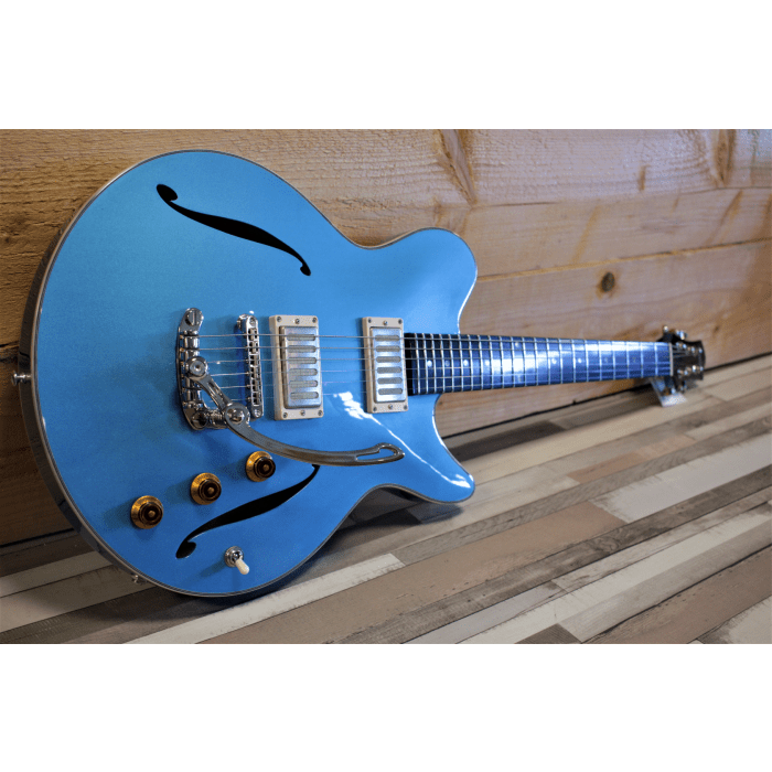 Heel bijzonder aan dit model is dat Eastman voor het eerst de samenwerking is aangegaan met Duesenberg / Göldo parts voor het ontwikkelen van de tremolo en locking tuners. De Seymour Duncan Radiator Phat Cat p90's zijn al niet minder in het oog springend! Tel bij dit alles de 24.75" scale op en het resultaat is een zeer warme, kalme sound met een zeer "luie" bespeelbaarheid.