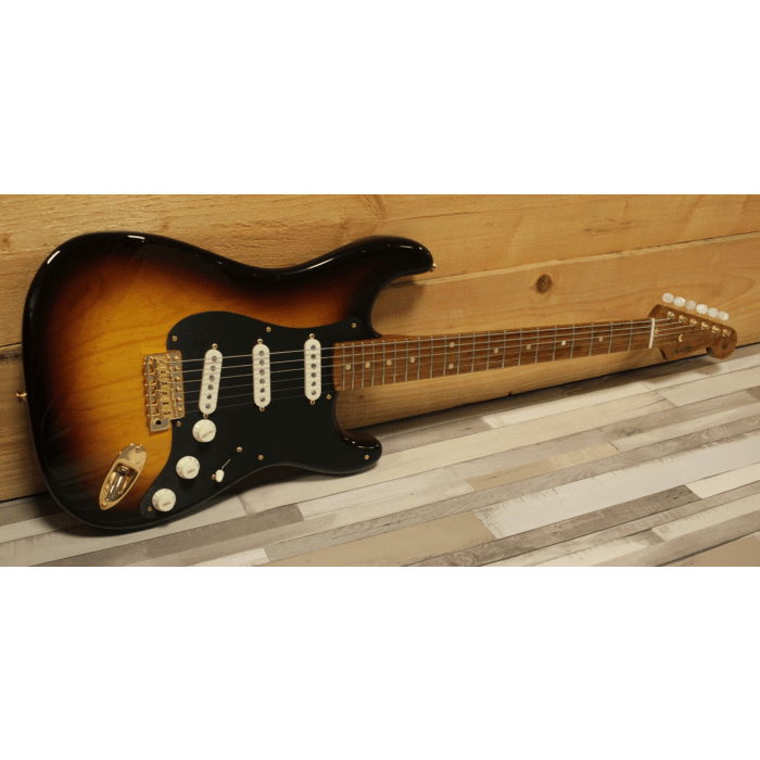 Van Custom Shop handgewikkelde Dual-Mag pickups tot Fat '50s 1/2 Blender Strat bedrading en Custom Shop vintage gesynchroniseerde tremolo, elk detail van deze gitaar is gekozen om zijn klankkwaliteiten te benadrukken en zijn prestaties te verbeteren. De Chocolate 2-Color Sunburst afwerking is gecombineerd met een zwart geanodiseerde aluminium slagplaat en gouden hardware om een adembenemend instrument te creëren met een tijdloze esthetiek.