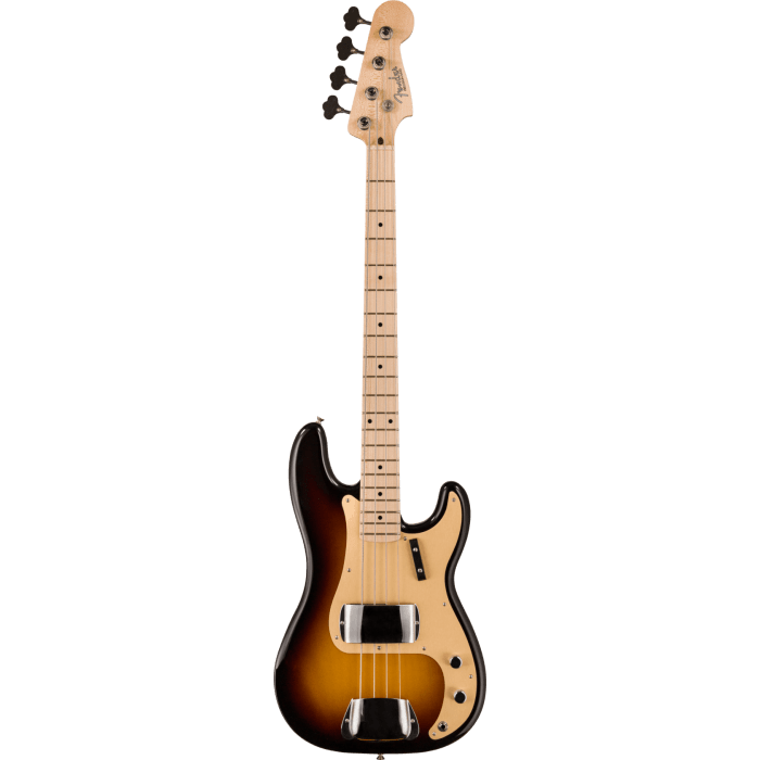 De handgewikkelde ’57 P-Bass pickup levert de karakteristieke, diepe vintage bas-“thump” en is te bedienen middels een master volume- en toonregeling. Andere kenmerken zijn onder meer een historisch correcte enkel-laags goudkleurige geanodiseerde slagplaat, een vintage-stijl basbrug met vier zadels, vintage-stijl stemmechanieken, een benen topkam en een disc string tree.