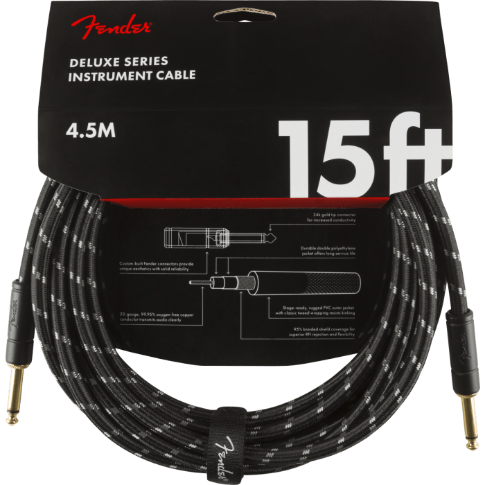 Deze kabels gebruiken een zeer stille gevlochten afscherming die is ontworpen om de zuiverheid van je toon te maximaliseren, en ze worden beschermd door een zacht geweven maar robuust tweed jasje dat ultieme bescherming biedt met klassieke Fender stijl
