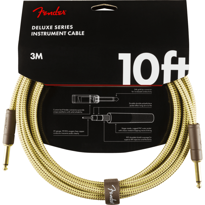 De kabels uit de Fender Deluxe Series bevatten materialen van de hoogste kwaliteit en een gevlochten afscherming om toonaangevende duurzaamheid, geleiding en transparantie te leveren. Onze topkabels hebben speciaal gevormde uiteinden met trekontlasting onder de behuizing - plus 24K vergulde connectoren die je geluid na verloop van tijd niet aantasten of verslechteren. Deze kabels gebruiken een zeer stille gevlochten afscherming die is ontworpen om de zuiverheid van je toon te maximaliseren, en ze worden beschermd door een zacht geweven maar robuuste tweed jas die ultieme bescherming biedt in klassieke Fender stijl.