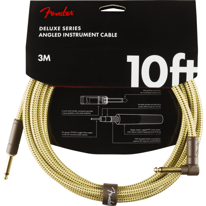 De kabels uit de Fender Deluxe Series bevatten materialen van de hoogste kwaliteit en een gevlochten afscherming om toonaangevende duurzaamheid, geleiding en transparantie te leveren. Onze topkabels hebben speciaal gevormde uiteinden met trekontlasting onder de behuizing - plus 24K vergulde connectoren die je geluid na verloop van tijd niet aantasten of verslechteren. Deze kabels gebruiken een zeer stille gevlochten afscherming die is ontworpen om de zuiverheid van je toon te maximaliseren, en ze worden beschermd door een zacht geweven maar robuuste tweed jas die ultieme bescherming biedt in klassieke Fender stijl.