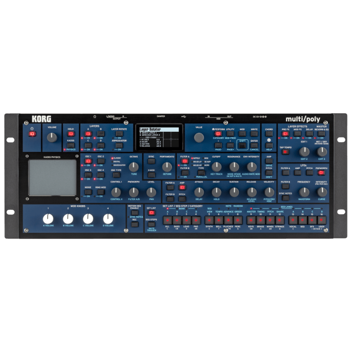 De Multi/Poly is de eerste Korg-synthesizer die gebruikmaakt van een nieuwe generatie analoge modelleringstechnologie en maakt het eenvoudig om verbluffende mashups te maken met sonische elementen uit de klassieke analoge synthese. Stroop je mouwen maar op en duik in een ware speeltuin van klassieke analoge, digitale wavetable en wave-shaper oscillatoren en een brede selectie geavanceerde gemodelleerde filters. Geef je geluiden vorm met gemodelleerde enveloppen, VCA's en portamentocircuits. Voeg organische klankvariatie toe met virtuele voicingkaarten. Je kunt de boel opleuken met Layer Rotate, waarmee je telkens als je op een toets drukt nieuwe programma's activeert. Moderne analoge modellering maakt het mogelijk om vrijwel elke bestaande technologie te modelleren om een onbeperkte reeks geluiden te bereiken.