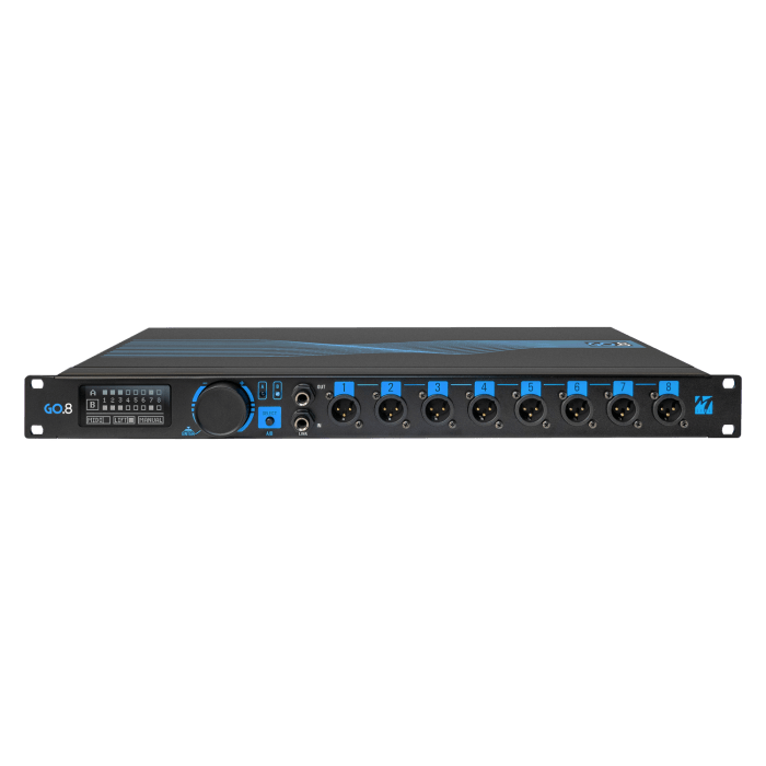 De GO.8 is ondergebracht in een stevige 19″ stalen rackbehuizing en biedt de keuze tussen 25-pins D-Sub of 6,35 mm TRS-ingangsaansluitingen, met D-Sub en XLR-uitgangen. De XLR-aansluitingen op het frontpaneel leveren een DI-signaal met gebalanceerd microfoonniveau, ideaal voor aansluiting op een snake-systeem. Dankzij transformatorisolatie worden brom en ruis door aardlussen effectief voorkomen. Aan de achterzijde zorgen D-Sub connectoren voor gebalanceerde line-level verbindingen.