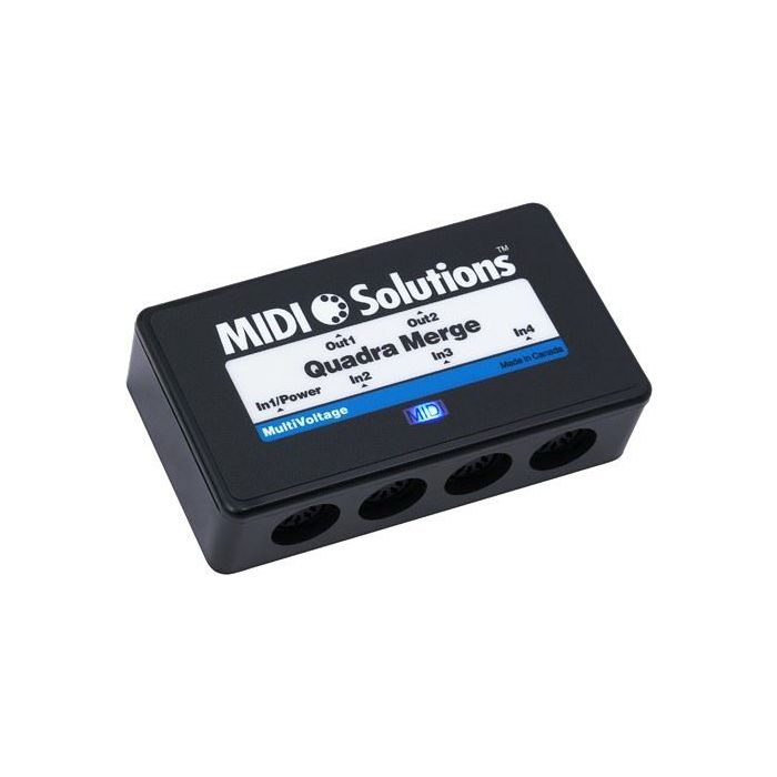 De MIDI Solutions MultiVoltage Quadra Merge voegt alle MIDI-messages die op de vier MIDI-ingangen verschijnen samen tot de twee MIDI-uitgangen. Alle soorten MIDI berichten worden samengevoegd, inclusief System Exclusive, MIDI Clock en MIDI Time Code berichten. Een snel samenvoegalgoritme zorgt ervoor dat alle MIDI-gegevens nauwkeurig worden verwerkt met zo min mogelijk vertraging.