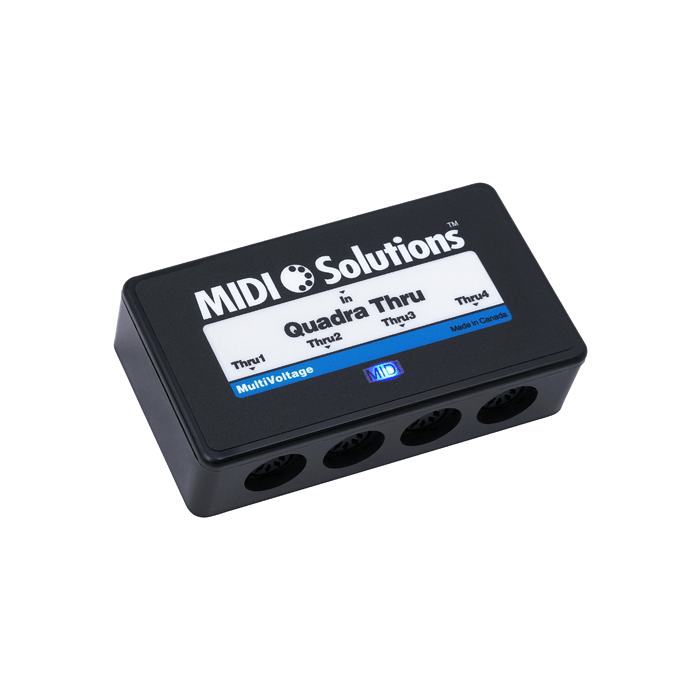 De MIDI Solutions MultiVoltage Quadra Thru is een 1-in 4-uit MIDI Thru Box. Alle MIDI-messages die op de MIDI-ingang van de Quadra Thru verschijnen, worden doorgegeven aan elk van de vier MIDI Thru-uitgangen. Actieve schakelingen zuiveren elke skewing van MIDI databits die is opgetreden op de ingang, waardoor een betrouwbare werking wordt gegarandeerd in opstellingen die serieschakeling of lange kabellengte vereisen.