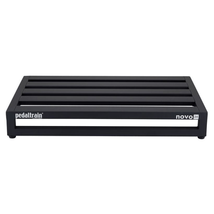 De Pedaltrain Novo 24 is een medium/groot pedalboard (61 centimeter breed bij 37 centimeter diep) waar veel pedalen op kunnen. Grote pedalen kan je bijvoorbeeld op de bovenste rij plaatsen en de pedalen met een normaal formaat op de onderste rij. Je kunt er tot drie rijen pedalen (normaal formaat) boven elkaar kwijt.