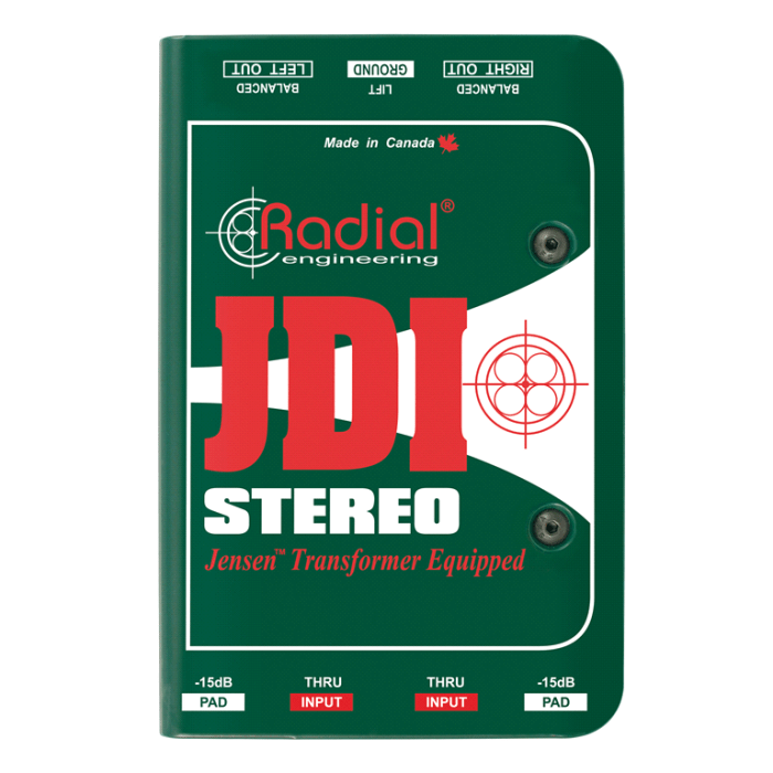 passieve DI-box, zeer sterke behuizing. Oerdegelijk. Topkwaliteit geluid, mede door de Jensen transformators. Perfect als DI op professionele stereo bronnen zoals synthesizers, stage piano'en orgels. Maar ook perfect voor een galvanische scheiding voor bijv. tape racks of DJ set. Geen phantom nodig.