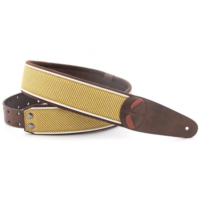 De Righton Mojo Tweed Brown is een veganistische gitaarband met een print die doet denken aan de voorklep van een versterker. De 6 cm brede gewatteerde gordel ligt comfortabel op de schouder, terwijl de lengte via het Righton Adjustment System (R.A.S.) kan worden ingesteld van 95 cm tot 145 cm.
