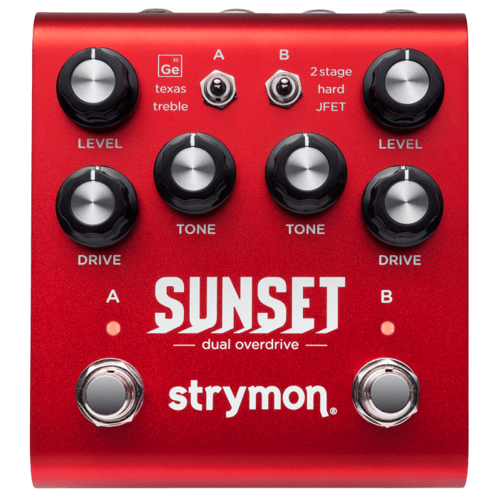 De opzet van het pedaal is overzichtelijk en zeer gebruiksvriendelijk terwijl Strymon veel functionaliteit en verscheidenheid aan sounds aan boord van de Sunset heeft gestoken. Met de Sunset heb je twee totaal gescheiden en onafhankelijk in te regelen overdrives tot je beschikking. Channel A biedt een pallet aan klassieke overdrives (germanium diode clipping / Texas soft clipping / treble booster), welke perfect zijn voor zingende en vloeiende overdrive tonen. Channel B biedt juist stevigere en complexere hard-clipping overdrives.