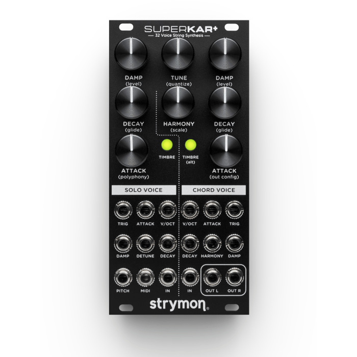 De Strymon SuperKar+ is een Eurorack voice module die Karplus-Strong synthese naar een nieuw niveau tilt. Deze techniek, gebaseerd op delay-feedback, bootst met verbluffend realisme het geluid van snaar- en buisklanken na. Het resultaat is een instrument dat altijd in beweging is: kleine veranderingen in attack, decay en damping zorgen voor een eindeloze variatie aan klankkleuren – van subtiel en organisch tot uitgesproken experimenteel.