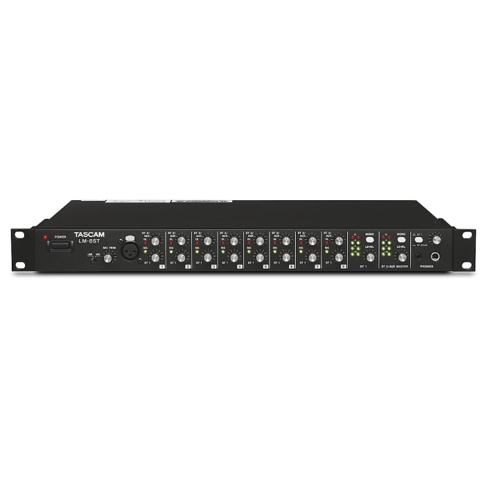 Aan de voorkant van het 1HE rackformaat bevindt zich een XLR microfooningang voor omroep of aankondigingen, met een aparte trimpot om het niveau nauwkeurig af te stellen. Elk kanaal heeft twee volumeknoppen waarmee je het signaal kunt toewijzen aan twee onafhankelijke stereo bussen. Deze twee stereo bussen kun je gebruiken om twee aparte mixen uit te sturen, of om geselecteerde kanalen naar een effectketen te sturen voor verdere verwerking. De Tascam LM-8ST is een overzichtelijke en doeltreffende oplossing voor het mixen van meerdere line-level bronnen.