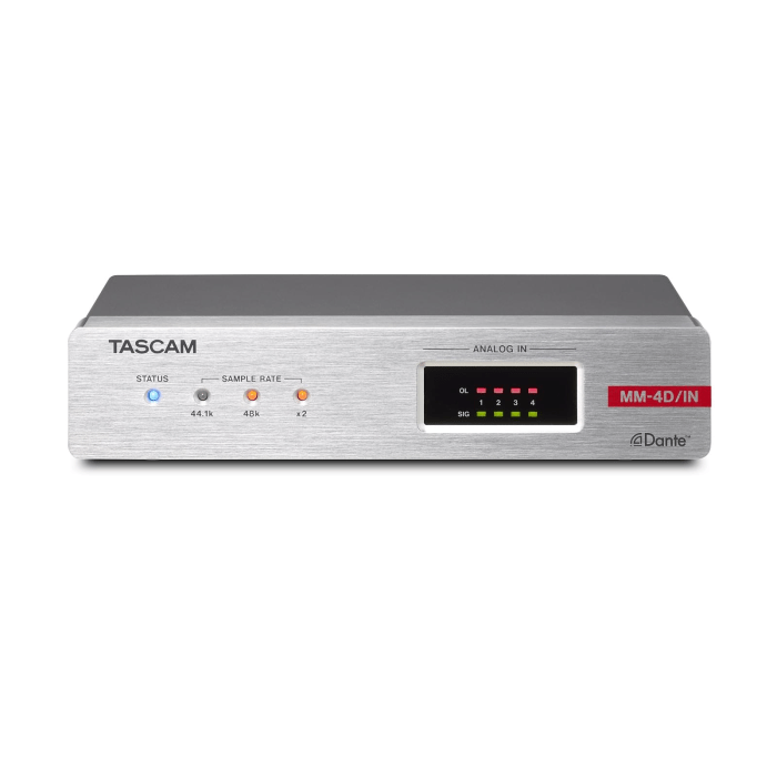 De Tascam MM-4D/IN zet vier microfoon- of lijningangen om naar vier Dante-uitgangen. Daarnaast ondersteunt het apparaat ook vier Dante-ingangen, zodat vrijwel elke audiobron binnen een bestaand Dante-netwerk gebruikt kan worden.