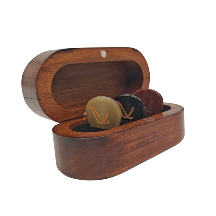 Of het nou gaat om kerst, sinterklaas, vader- / moederdag, verjaardag, pasen...we hebben hét ultieme cadeau voor de gitarist! Wambooka maakt plectrums van specifieke materialen. Deze Flat collectie bestaat uit een drietal handgemaakt dunne plectra (1.5-2 mm) van verschillende materialen. Het geheel is sierlijk verpakt in een prachtig houten doosje waarvan het deksel afsluit met een magneet. Hierin kun je de plectra opgeruimd en afgesloten bewaren of juist in het zicht tonen, want ze mogen gezien worden!