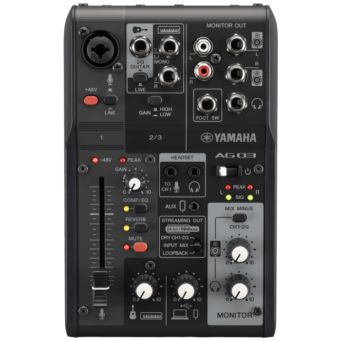 De Yamaha AG03 Mk2 is een vernieuwde, 3-kanaals mixer, ontworpen voor hoge kwaliteit audio voor (live)streams, gaming, webcasting en live muziek. Deze robuuste mixer geeft je 24-bit/192kHz audiokwaliteit, USB-connectiviteit, onboard DSP-effecten en loopback-functionaliteit. De Mk2 introduceert een 1/8-inch, 4-polige mini-I/O om een verscheidenheid aan streaming-opties mogelijk te maken, een mute-knop en een groot aantal verbeteringen aan de bouw, het ontwerp, de interne circuits en de algehele prestaties - allemaal om een geoptimaliseerde, intuïtieve bediening te garanderen zonder in te boeten aan kwaliteit. De AG-03 is de meest compacte versie uit de serie.