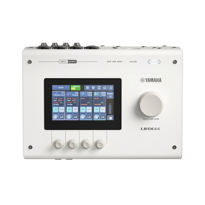 De Yamaha URX44 W (White) is een uitgebreide 4-in/4-out USB-C audio interface die is ontwikkeld voor moderne muziekproductie, streaming en podcasting. Binnen de URX-serie positioneert de URX44 zich als audio-only model met extra in- en uitgangen ten opzichte van de URX22. Met vier URX-microfoonvoorversterkers, 32-bit/192kHz resolutie en hoogwaardige AD/DA-converters biedt deze interface een hoge mate van detail, controle en flexibiliteit. Het geïntegreerde touchscreen zorgt voor directe toegang tot instellingen, DSP-mixing en effecten, waardoor je snel kunt schakelen en efficiënt kunt werken.